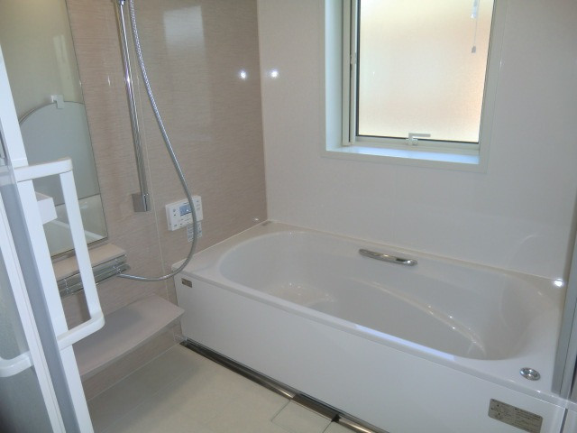 落ち着きあるカラーと床のタイルが安全・安心に入浴できますね。