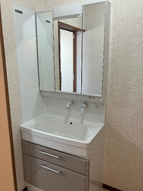 正面にあった窓を塞ぎ、使いやすいように鏡を設置しました。