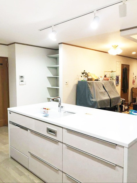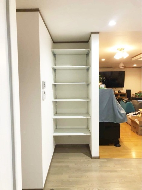 キッチンの位置が変わったため、冷蔵庫スペースは収納へ。可動式の収納にすることで、スッキリ収納できます。リビングからは見えず、収納が可能となりました。
