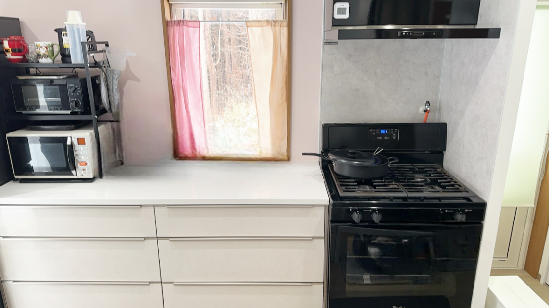 キッチン後ろにカウンター収納を設置。ガスコンロの高さに合わせて作業しやすいカウンターを選びました。