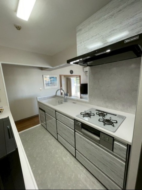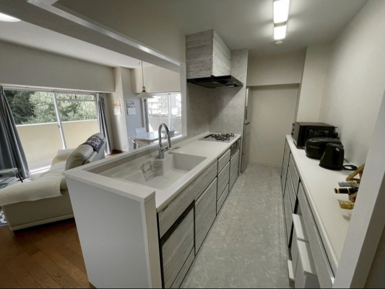 冷蔵庫との間にホーローパネルを貼った壁を作り熱の心配もなくお掃除もしやすくなりました。
