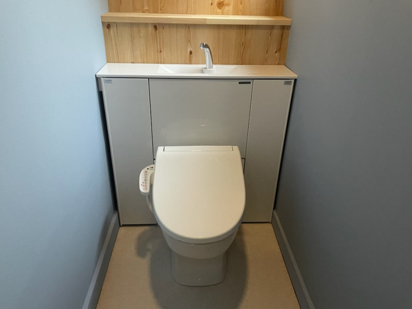 トイレ空間の幅が少し広いので、トイレの手前にトイレットペーパーが収納できる木製ボックスカウンターを現場造作で取付させていただきました。塗装はもちろん施主様DIYです♪