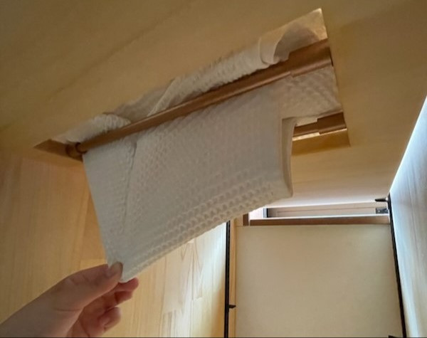 タオルが下から取り出せるように、パイプを2本入れてその間からタオルを滑らせています。パイプがクルクル回るのでタオルの取り出しがスムーズ♪