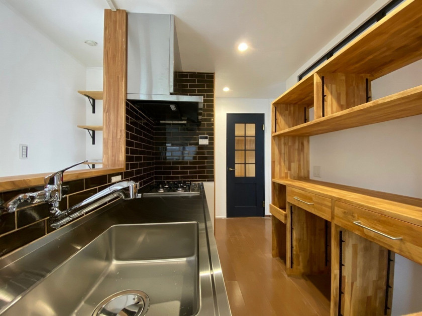 元々I型造作対面のキッチンでしたが、LDKの中でキッチンを移設し、新たな場所にI型造作対面のキッチンにしました。収納はご自身で自由に考えてレイアウトしていかれるとのことで、ステンレス天板のみを設置することに。レンジフードはお手入れが簡単でスタイリッシュになるタカラスタンダード製のVRAS-Eシリーズを採用。DIYのタイル壁とも相まって、ステンレスが際立つかっこいい雰囲気のキッチンになりました。背面は、大容量の家電収納兼食器棚を現場造作。塗装は施主様のDIYです。