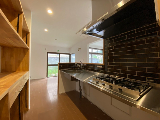 レンジフードはタカラスタンダード製、ステンレス天板は別途手配品、水栓金具とガスコンロは施主様御支給品です。タイルは施主様がDIY施工されました。背面収納は現場造作のオリジナル家具です。
