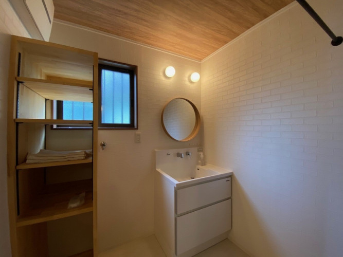 ミラーと照明は施主様御支給品です。丸い形状のおしゃれなミラーが空間のアクセントです♪