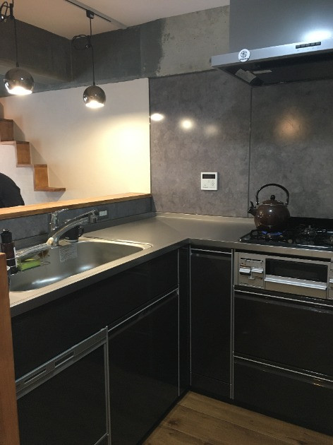 元々のリビングとキッチンの間仕切り壁を撤去し開放的になりました。コンロ壁面は梁下までキッチンパネル貼りです。梁そのものはコンクリート表し、ステンレス天板の組み合わせにして、素材感のあるインダストリアル空間にしています。扉もホーローなので猫ちゃんが来ても安心です。