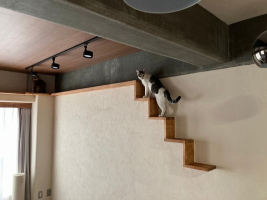 リビングの壁には、キャットウォークを大工さん造作。高いところが好きな猫ちゃんの遊び場になっています♪こちらの壁面にプロジェクターの大画面が映し出されます!