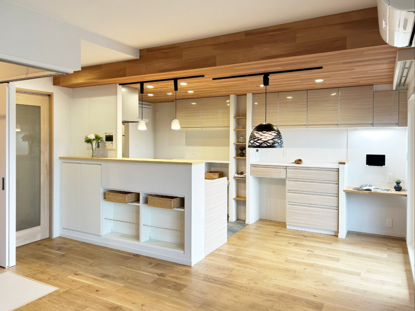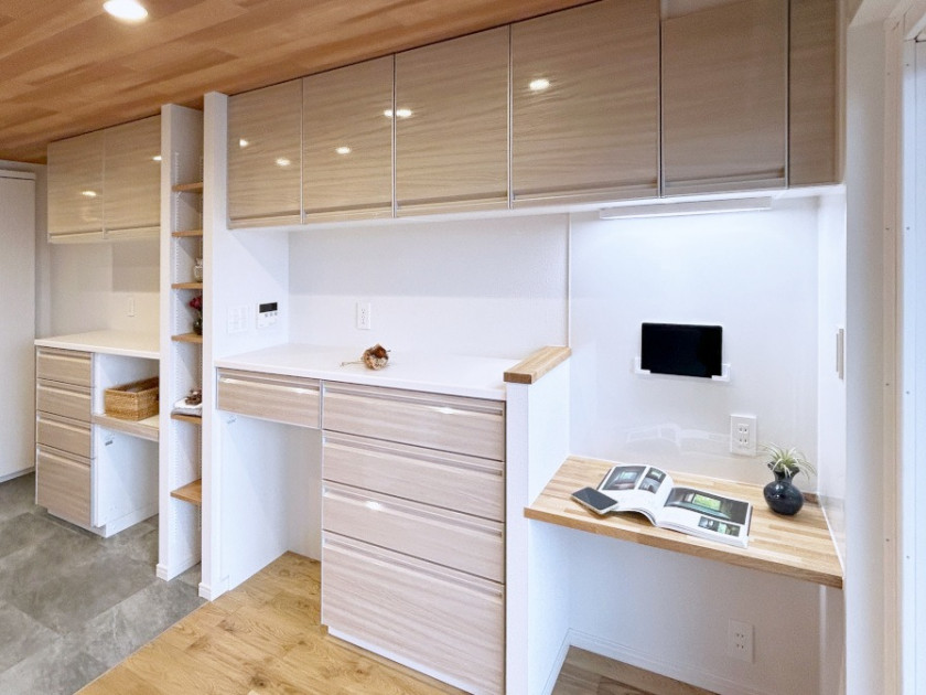 キッチンの背面収納を壁一面に設置した事により、視覚的にも広がり収納力も抜群に高まりました。