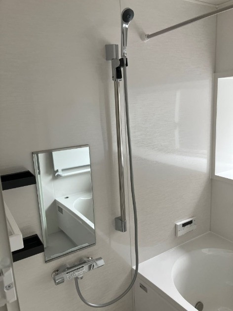 浴室解体後、シロアリ防蟻や断熱材など施工し、システムバスを設置。タイルが剥がれ落ちそうだったシャワー廻りがきれいになりました。