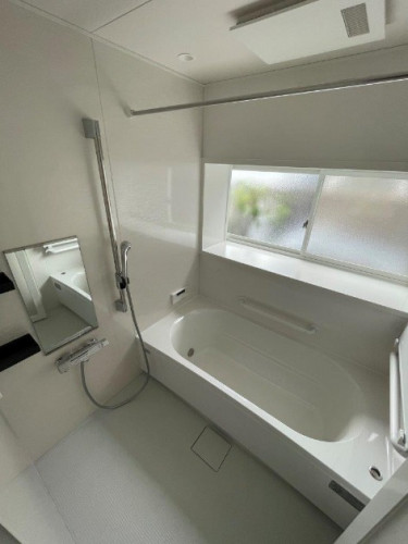 ホワイト系の明るい浴室となり、換気機器は浴室暖房乾燥機タイプなのでランドリーパイプも付けてあります。