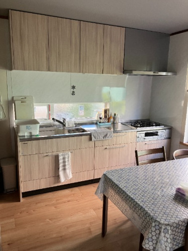 吊戸用昇降棚を付けたことによりキッチン収納の使い勝手がアップしました。また、木目を基調としたデザインにより今までとは違う雰囲気に仕上がりました。