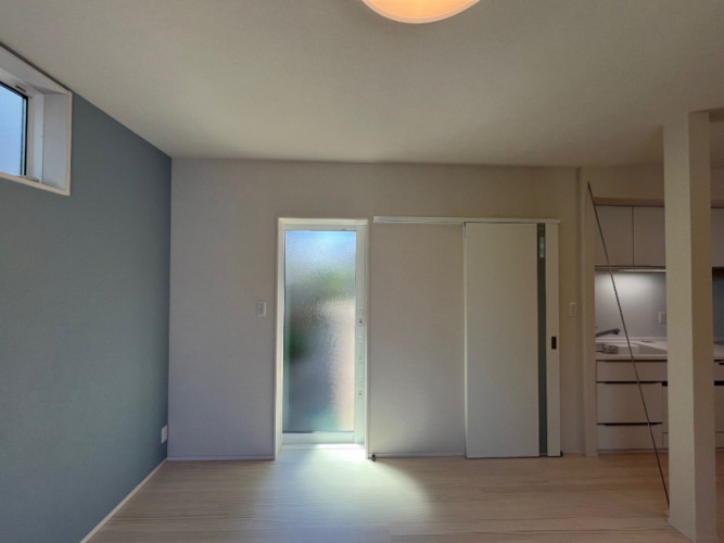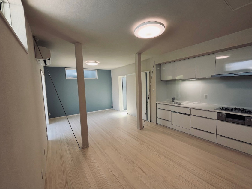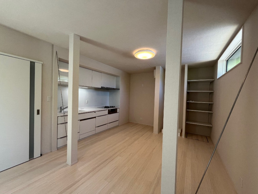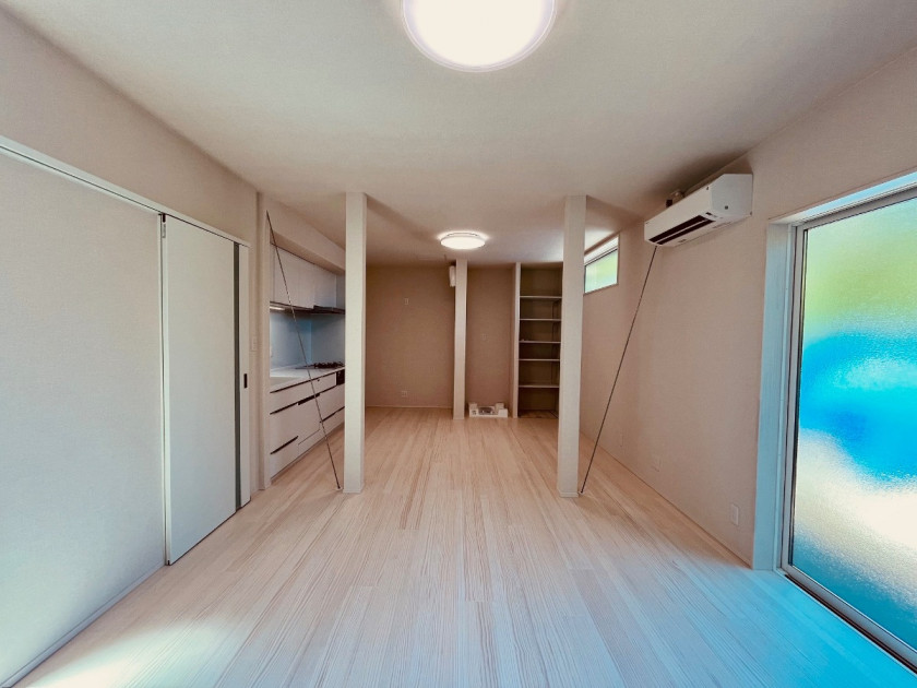 物置状態になっていた8帖ダイニングキッチンと、8畳の和室(居間)で構成されてた築40年以上の平屋の離れを、新に迎える息子様家族が出来る限り快適に過ごせる様にリノベーション。2室の間仕切り壁の柱を残し壁面を撤去、筋交いをステンレス製のブレスに取り替える事で、耐震性を落とすことなく出来る限り開放的に繋ぐ事で約16帖のL.D.K空間を実現した。