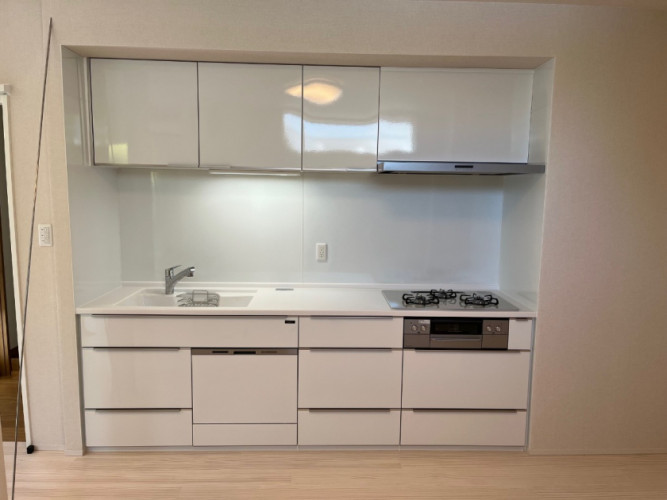 キッチンには、収納効率と意匠性の高いレミューを選定し、色合いを無垢床材など合わせてカラーコーディネートする事で、実空間以上の広さを感じらるすっきりとした空間に仕上げた。