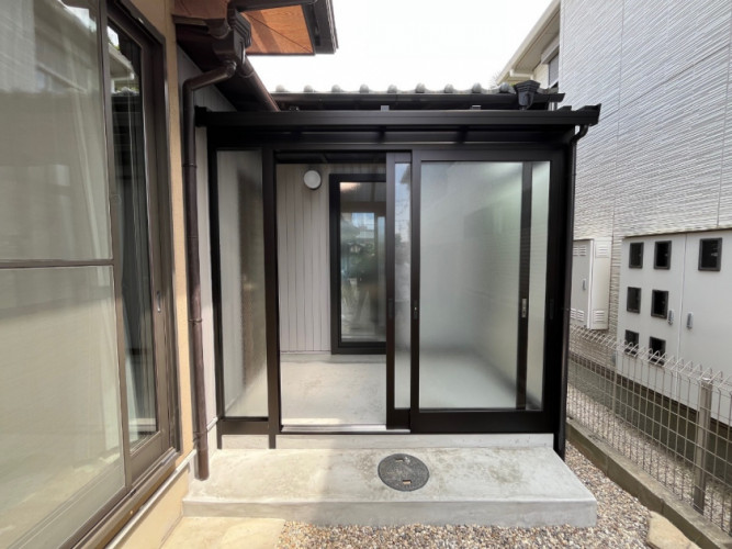 サッシの形状変更と風除室の増設で、子世帯専用の玄関を設けた。