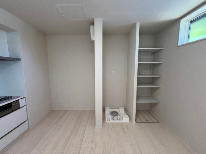 家事らく動線として、キッチン横に洗濯機置き場と、効率的な収納が可能なオープンの可動棚を増設。