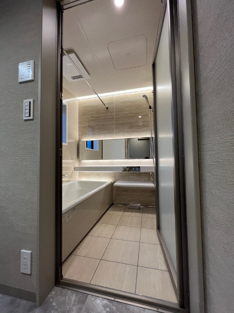 暖色系の浴室と寒色系の洗面脱衣室の異なるカラーテイストのインテリアを、浴室ドア枠のカラーをグレージュにする事で、シームレスに繋ぎました。