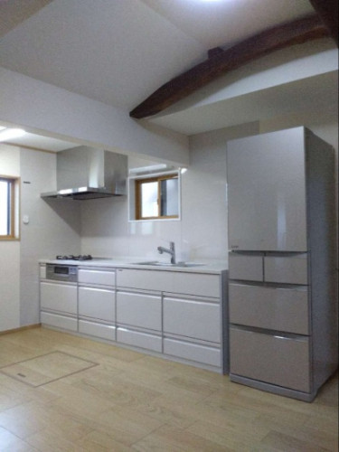 使い勝手の良いシンプルなI型キッチンに交換、下台にたっぷりと収納が増え壁全体はキッチンパネルでお掃除ラクラク。天井を解体したら出てきた⁉ なんとも大きな梁がダイニングの主役になりました。