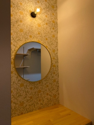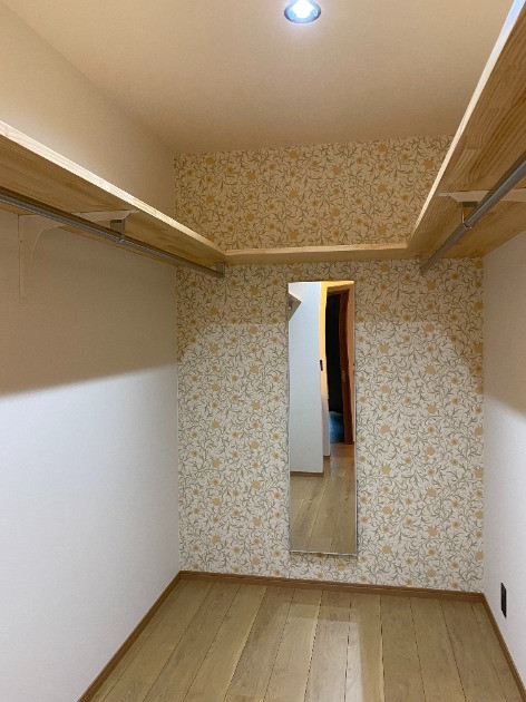 キッチン横の廊下だったところに、ウオークインクローゼットを設けました。姿見も設置してあり、着こなしのチェックができます。