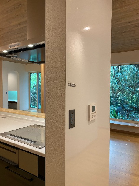 レンジフードを設置するための壁の裏側にはキッチンパネルを全面に貼りました。裏側なのでクロスでもよかったのですが、タカラのキッチンパネルはマグネットが使えるため、非常に便利がいいんです。