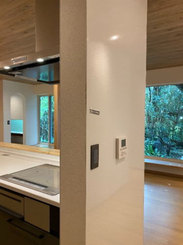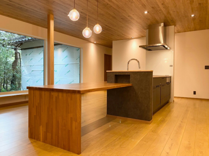小さなお子さんがいらっしゃるので、対面式キッチンは作業中でも見守ることができ、また緑いっぱいのお庭も眺められます。