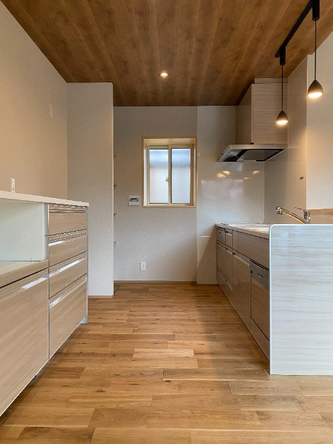 お子さんを見守れるよう対面式キッチンにし、空間をゾーニングするため、キッチンに下がり天井を設けました。