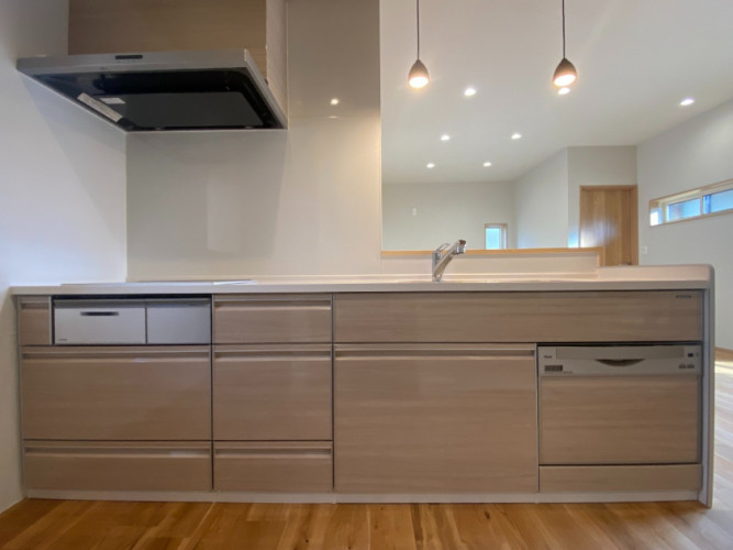 対面式キッチンにして、いつもお子さんを見守れるようにしました。お子さんが大きくなったら、料理しながらでも親子の会話がはずみますね。