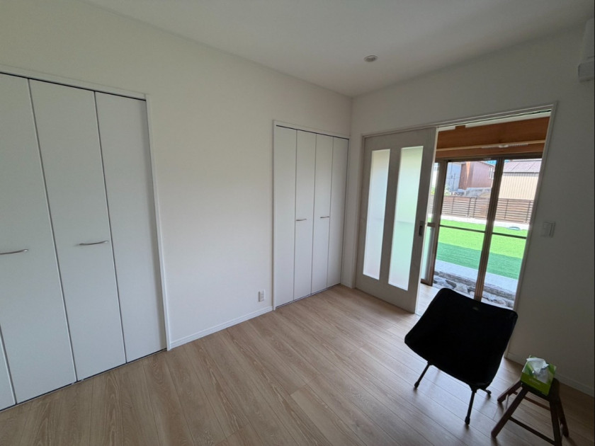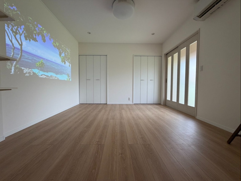 リビングには壁にプロジェクター投影することで大画面でお孫さんも楽しめる空間にしました。収納をしっかりとることで、広々としペットと一緒に遊ぶこともでき、引戸を開ければペットが庭へ自由に移動でき、風通しもよくなる空間にしました。