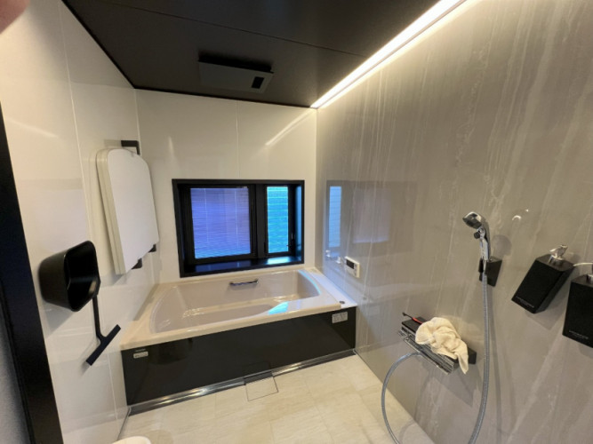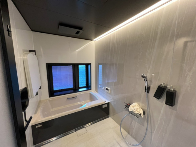 御影石の冷たいお風呂から、最新のシステムバスに変えました。当社では、お客様のライフスタイルに合った理想のバスルームをご提案し、心地よい空間をお届けします。天井をシックな黒にして、落ち着いた大人の雰囲気を演出した浴室リフォームです。これにより、浴室全体がモダンで洗練された印象に生まれ変わりました。興味をお持ちの方は、ぜひお問い合わせください。
