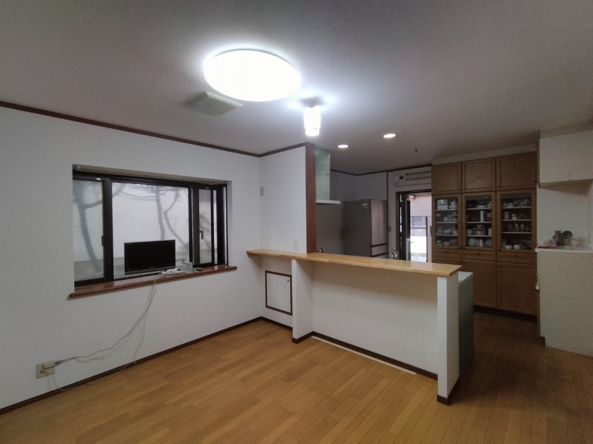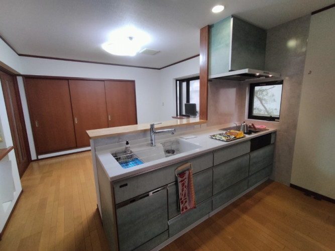 以前のキッチンは導線を考えたL字型でしたが、子供たちも独立した今、キッチンの広さよりも使いやすさを優先しました。キッチン本体はレミューI型255cmです。L型の調理台とコンロがあった部分は、今回のリフォームでは壁面とし、キッチンが広々とした空間になりました。また、これにより今まではあまり存在感がなかった窓も、明るさと新鮮な空気をとりいれるための欠かせない存在となりました。広々と動きやすいこと、空気が循環すること、これからの暮らしに重要かもしれませんね。
