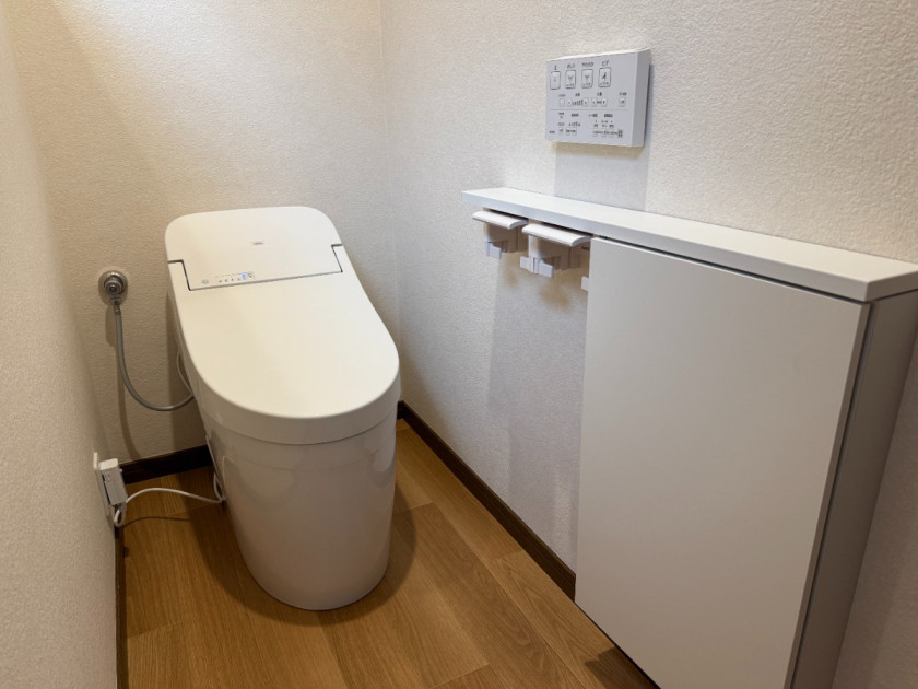 タンクレストイレは少なく水量で効率よく洗浄できるので、従来のタンク式トイレと比べて大幅な節水になり水道代の節約にもなります。タンクがない分、奥行きや高さが一回り小さくなったので狭いトイレでも圧迫感が少なくなりました。