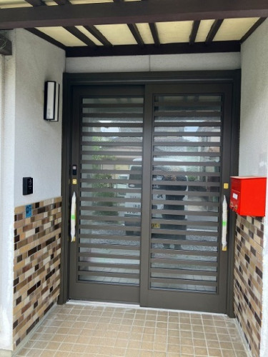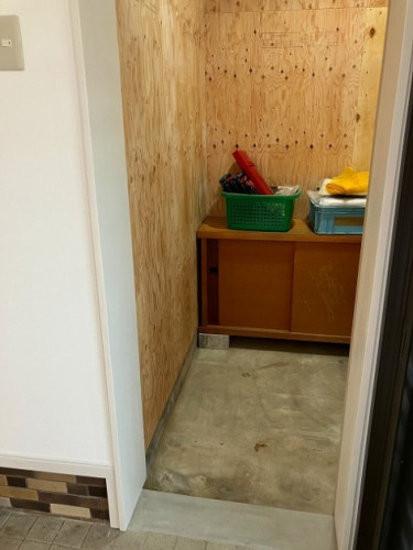 外からの出入りによる物入れを、玄関内から出入りできるシューズクロークに造り変えました。