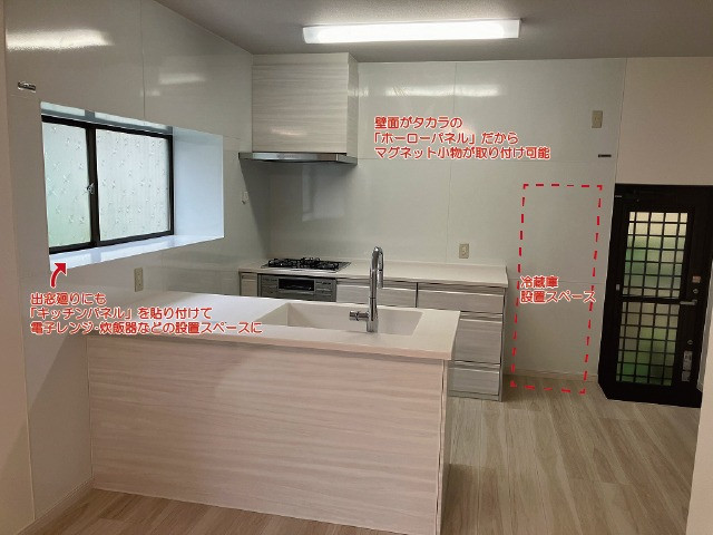 出窓廻りにも「キッチンパネル」を貼り付けて電子レンジ・炊飯器などの設置スペースに。