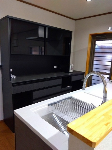 カウンターキッチン(トレーシア/タカラ)にして食器棚、冷蔵庫も北側にまとめることで、ダイニングが広くなり、大人数の家族でダイニングテーブルを使って食事ができるようになりました。