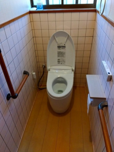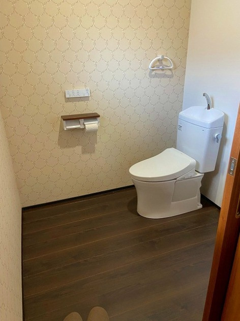 1Fトイレはタイル床をフローリングに変えて段差を解消。