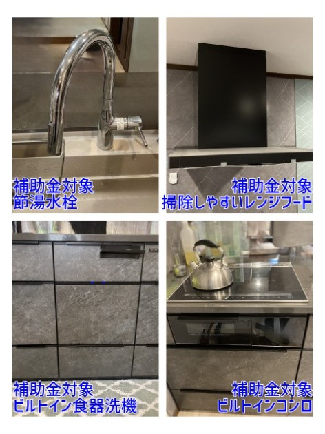 キッチンは「節湯水栓」「掃除しやすいレンジフード」「ビルトイン食器洗機」「ビルトイン自動調理対応コンロ」の4つが補助金の対象です。
