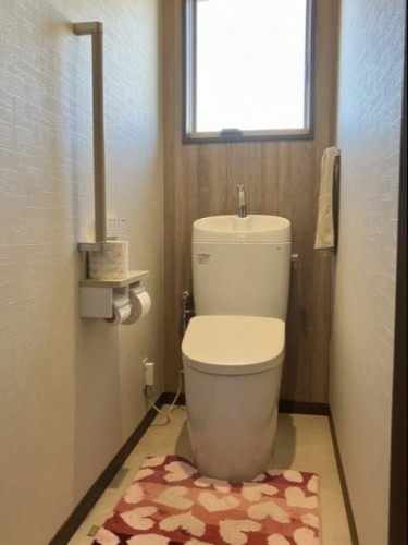 2FトイレはTOTOのピュアレスト。こちらはタンクに手洗いが付いているタイプです。トイレ奥にはアクセントになるデザインのクロスを選択。手すりも設けました。「手すり」は家屋内で1ヶ所のみが補助金の対象。「節水型トイレ」は家屋内の複数個所で設置した台数分にて申請できます。