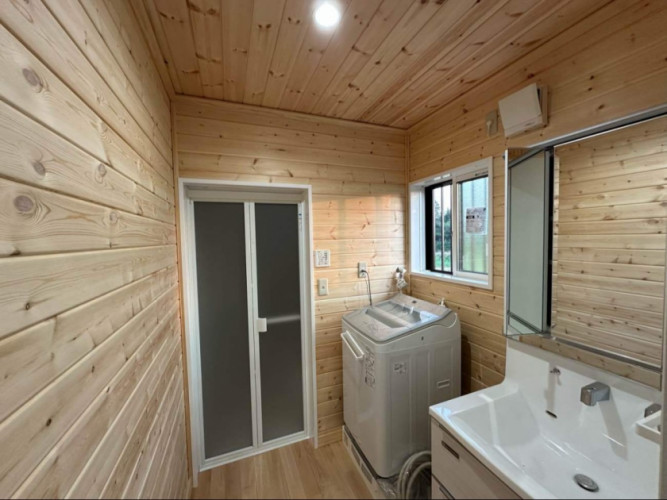 木目調の仕上げがとても心地よく、まるで山小屋や温泉旅館にいるような雰囲気です。毎日使う場所なのに、特別感がありますね。