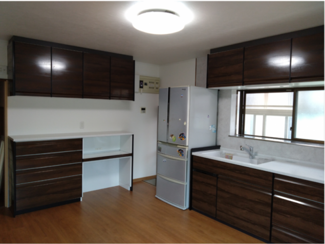 10畳のリビングキッチンの改修工事・クロス貼替・床貼り・掘りごたつから床下収納庫設置・建具取替を実施したことにより、すっきりと風通しの良い片付けのしやすいリビングキッチンとなりました。