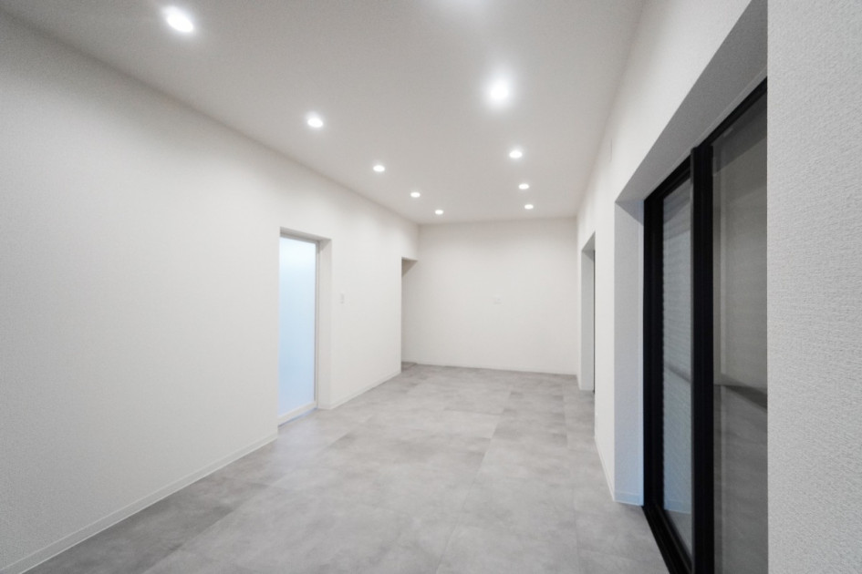 暗く閉ざされた和室を、開放感のあるLDKへ大胆に一新。天井や柱を撤去し、空間を一体化。照明や建具、床材も直線的に整え、奥行きと明るさを感じさせるミニマルな空間へと仕上げました。