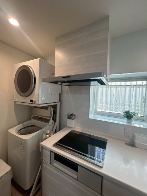 キッチン横に洗濯乾燥機を設置し、壁面をタカラのキッチンパネルに変更。マグネット収納で洗濯用品をすっきり整理でき、掃除も簡単です。IH横でも、タカラのレンジフードは油やにおいも気になりにくく、家事が快適に。欧米スタイルの効率的な動線で、日々の暮らしが快適になりました。