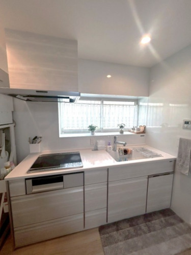 吊戸棚をなくし、壁厚収納もキッチンパネルに変更。キッチン単体でも十分な収納量を確保しつつ、空間はぐっとすっきり。さらにカップボードを追加し、収納力も十分に確保。白を基調としたキッチンパネルは、明るく清潔感のある空間に自然に馴染み、使い勝手とデザインの両方で満足度の高いキッチンに生まれ変わりました。