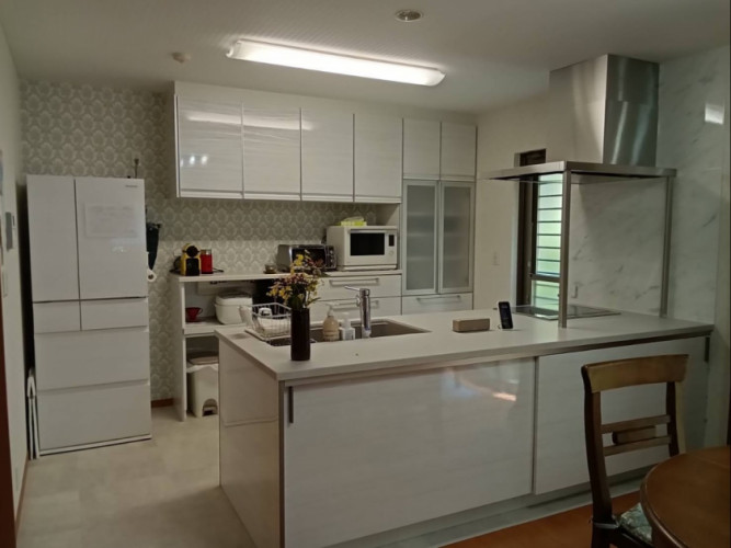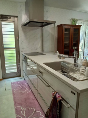 コンロ前の壁を撤去しアイランドキッチンにしたいとご希望でしたが、スペースの都合上ペニンシュラ型のキッチンをご提案しました。キッチンはプランの自由度が高く、「家事らく」に特化したレミュ―を採用し、忙しい毎日にゆとりが生まれました。コンロ前をガラス板にすることで、開放感をもたせつつ匂いにも配慮しています。また家電収納はコストダウンのためトレーシアを採用。たくさんの食器やストック類を収納できるスペースを確保しました。