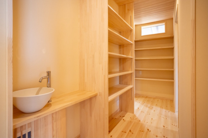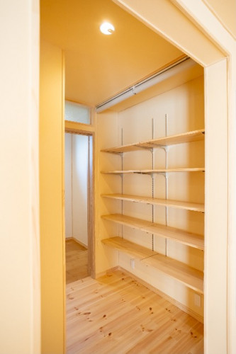 内玄関からすぐにパントリーへ。キッチンへとつながる大容量収納で、買い物帰りの片づけもスムーズになりました。