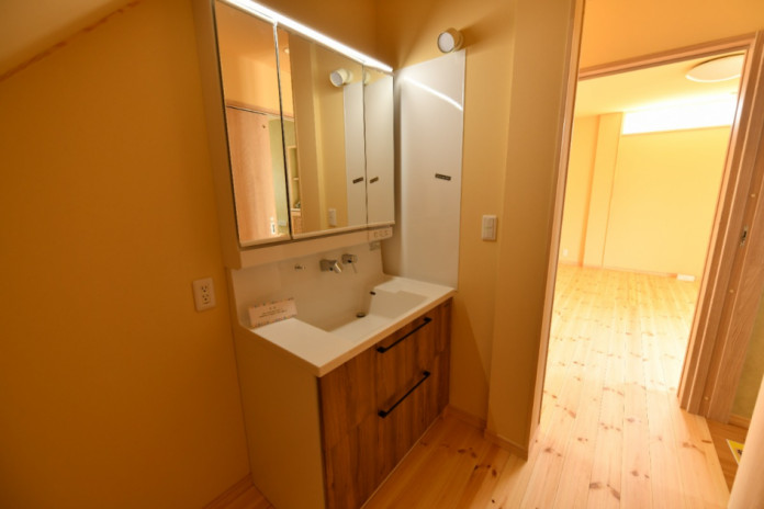 以前は脱衣室にあった洗面台ですが、脱衣室前に移動したことで浴室使用中にも使えるようになりました。