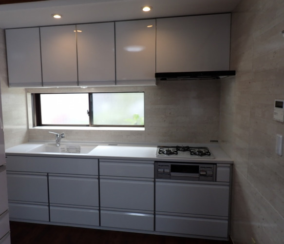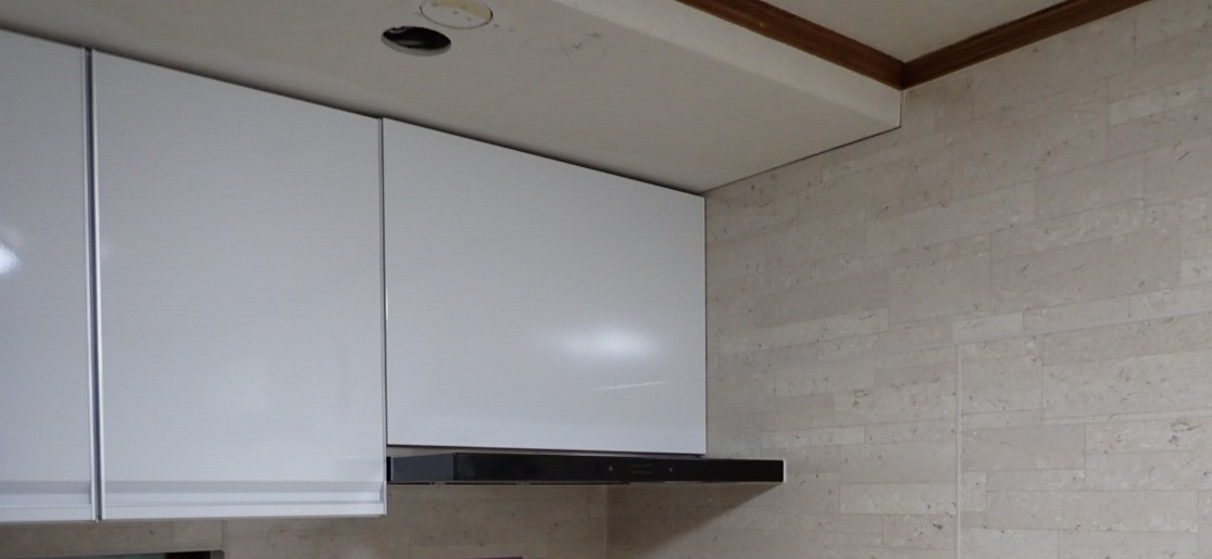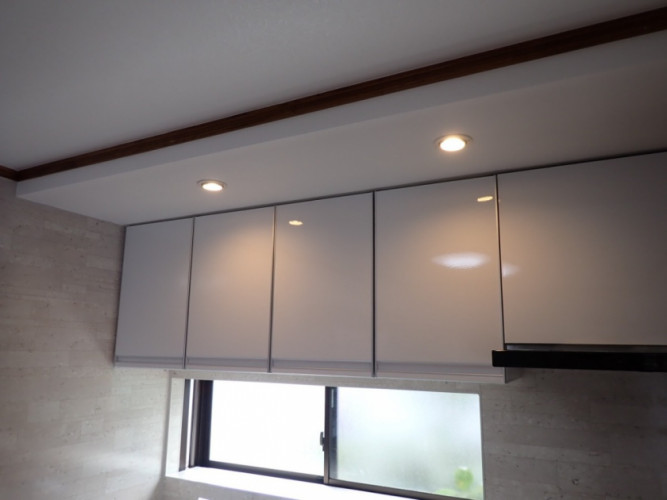 キッチンウォールキャビネットに底面ホーローカバー吊戸LEDダウンライトを設置しましたが、