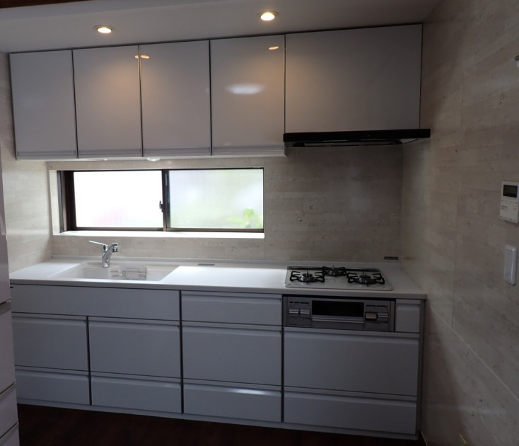 キッチンウォールキャビネット前の天井に埋込LEDダウンライト拡散タイプを2灯設置させていただき、