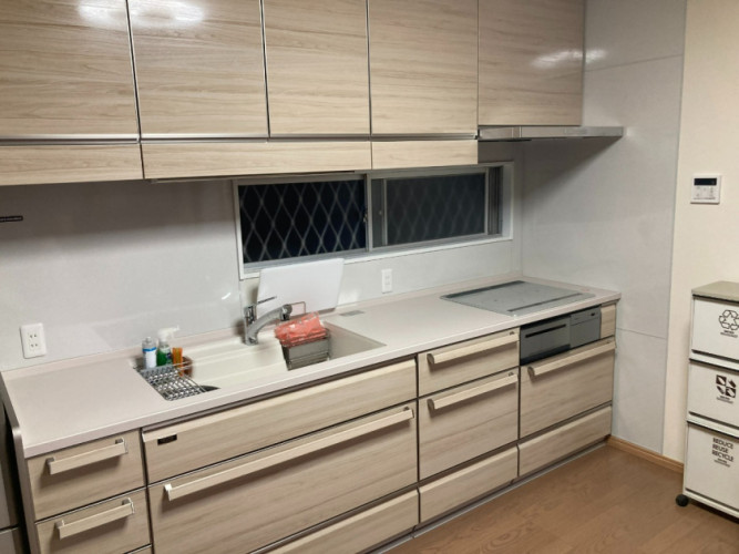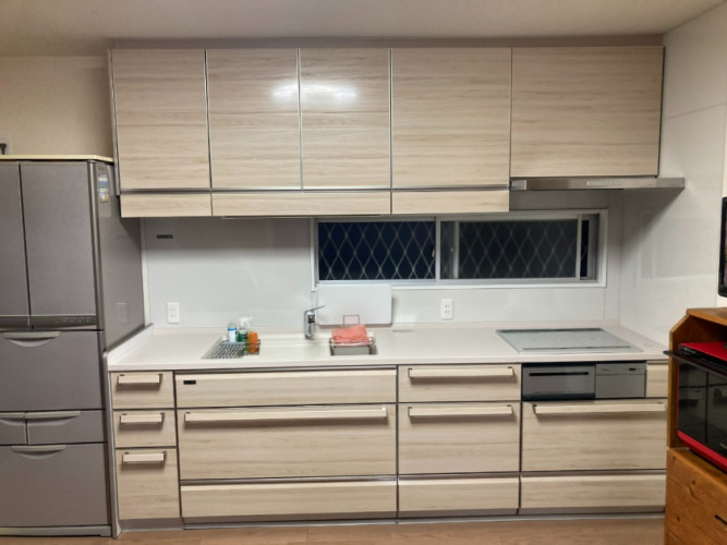 今までのキッチンはL型キッチンでキッチンの空間を狭くしてました。人が移動するのにも狭く感じ、少し窮屈な感じがしてました。キッチンを撤去し室内壁も撤去、床フローリングも撤去。和室との引戸も撤去しました。キッチンは、レミューのI型2700㎜。室内と調和の取れたキッチンで、床や壁とも調和して、素敵なキッチンスペースとなりました。I型にしたことにより、キッチン空間は広がり以前より移動がしやすくなったと思います。和室との境の扉は上吊りの3枚引戸(袖壁有り)にしてキッチンと和室が繋がりのある空間と致しました。