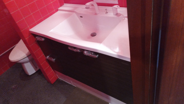 店舗トイレ内の手洗交換。 床を水を流して清掃するため下部が腐っていた為、1段高くして施工させて頂きました。