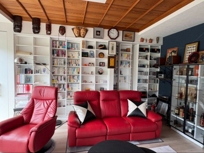 しまったままの本もたっぷり収納した大型の可動式本棚は壁一面に設置しました 趣味の音楽を聴きながら好きな本を読むことは大切な時間です